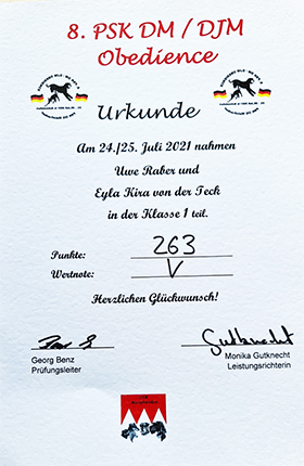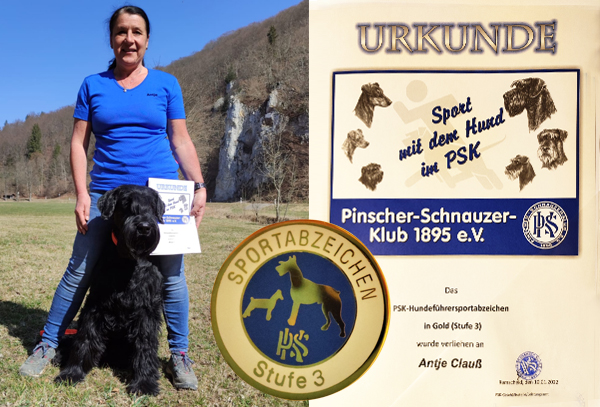 Das PSK Hundeführersportabzeichen in Gold (der Stufe 3) erreichte Antje Clauß mit ihrem Ajani von der Teck bei ihren gemeinsamen Prüfungen wie z.B.