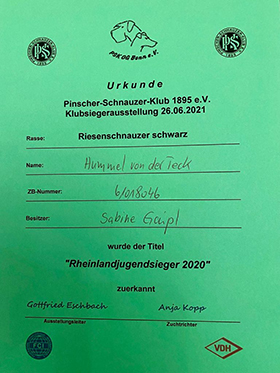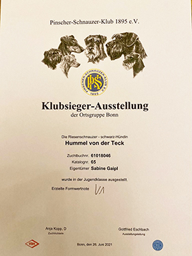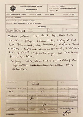 Zunächst besteht Hummel von der Teck ihre Zuchtzulassung (Phänotyp- und Verhaltensbeurteilung) mit Bravour. Dann erhält sie auf der Doppel-KSA der OG Dormagn-Grevenbroich und Kleve-Uedem am 11./12.6. beide Male vorzügliche Bewertungen (V2) und hat damit alle geforderten Bedingungen zur Zuchtzulassung erfüllt.